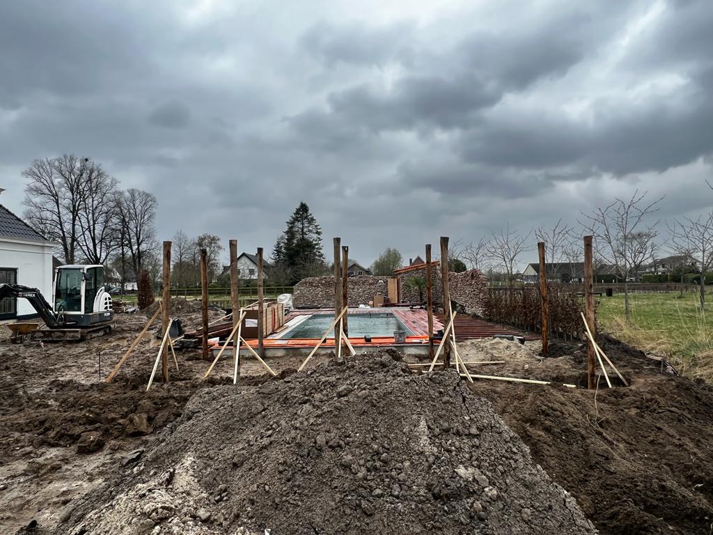 Na het opruimen is de ondergrond volledig opnieuw opgebouwd. Dit is een cruciale fase binnen ieder tuinproject, omdat een stabiele basis toekomstige verzakkingen voorkomt. De bodem is geëgaliseerd en waar nodig opgehoogd, waarna een solide funderingslaag is aangebracht. Tevens is aandacht besteed aan de afwatering, zodat regenwater op een natuurlijke manier kan wegstromen en plassen worden voorkomen. Door deze zorgvuldige voorbereiding is een duurzame basis gecreëerd voor het verdere werk.