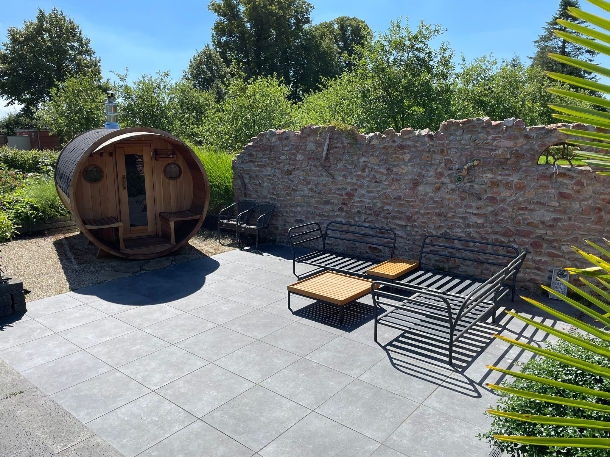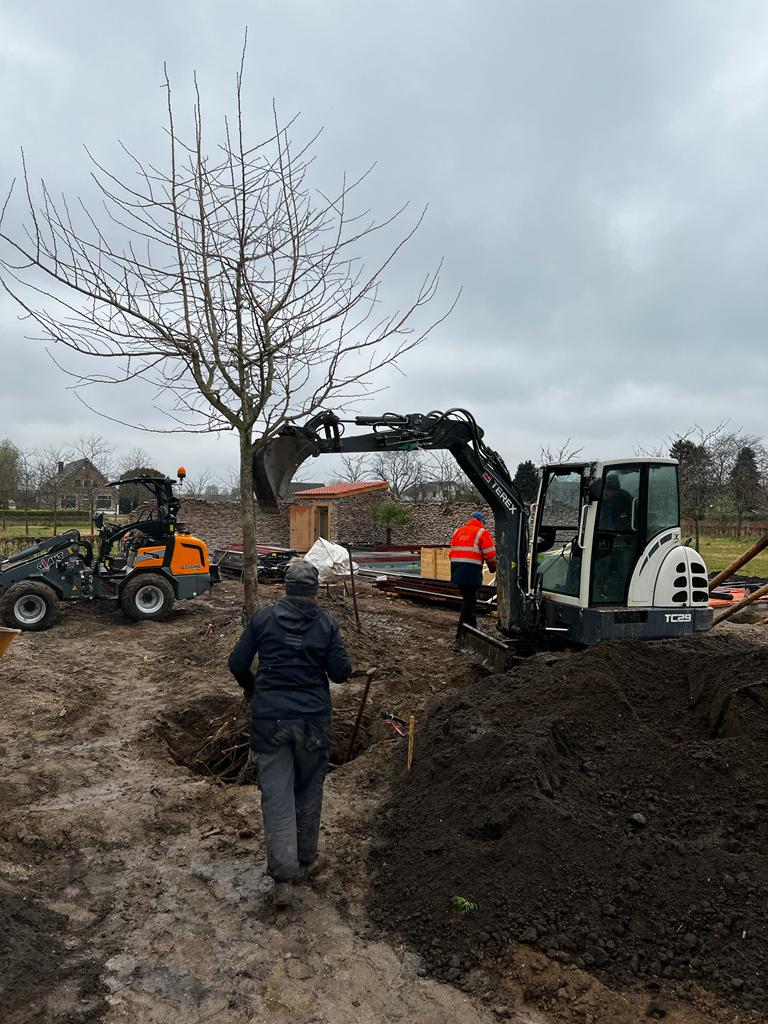 Vervolgens is gestart met het graafwerk voor de nieuwe indeling van de tuin. Hierbij zijn hoogteverschillen aangebracht om verschillende zones te creëren, zoals een ruim terras, een looppad en een lager gelegen gedeelte voor groen. Ook zijn sleuven gegraven voor het verleggen van leidingen en afwatering. Tijdens deze fase is voortdurend afgestemd met de opdrachtgever, zodat eventuele aanpassingen direct konden worden doorgevoerd. Deze flexibele werkwijze zorgt ervoor dat het eindresultaat volledig aansluit bij de wensen van de klant.